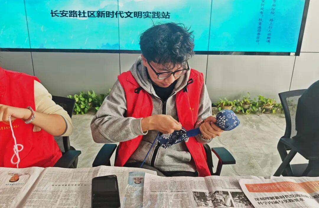 活动现场,大家围坐一起动手制作艾草锤。志愿者们专注地将艾草填充进蓝纹布艺中,一针一线细细缝制,把春日艾草的清香与传统手作的温度融入其中。艾草锤不仅承载着清明时节祛秽祈福的民俗寓意,更在亲手制作的过程中,传递着健康养生的理念与邻里温情,让传统文化在指尖鲜活传承。