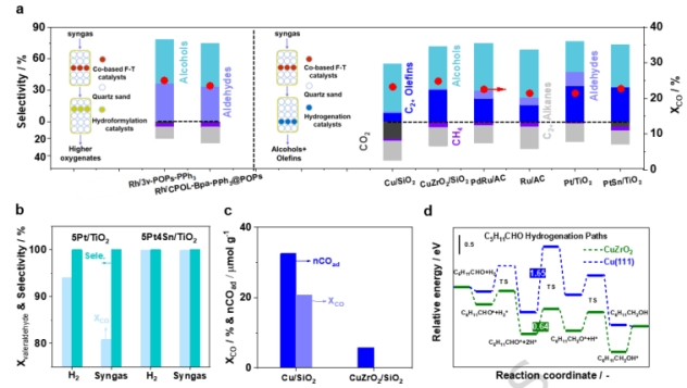 C₄⁺长链醇是食品、纺织、医药、能源等领域的关键基础化学品,全球市场规模庞大。然而,现有工业路线存在流程复杂、催化剂分离困难、无法规模化生产特定结构醇等短板,亟需开发新型高效催化转化体系。该研究构建了模块化串联催化体系,耦合合成气定向转化、烯烃氢甲酰化、醛选择性加氢三大功能模块,实现了合成气高效定向制备C₄⁺长链醇。研究取得突破性进展:C₄⁺长链醇选择性高达80%,CO₂副产物选择性低至1%,碳利用效率超过95%,选择性与时空产率均远超现有文献报道水平。该体系在宽工况下选择性稳定,可连续运行超130小时,具备显著的工业化应用潜力。